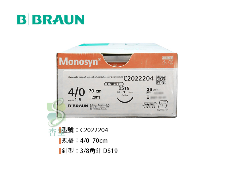 Monosyn單股可吸收縫線4/0(3/8角針)DS19 C2022204